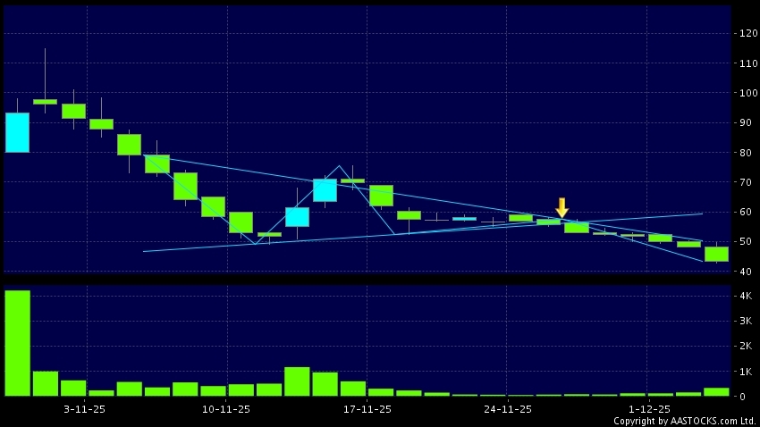 Triangle Breakout means the volatility of price movement is decreasing, stock price finally broke the bottom of triangle. A downward trend will start.(HK stocks quote is delayed for at least 15 mins.)