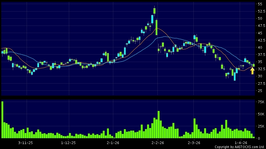 山东黄金(01787.HK) -0.120 (-0.368%) 沽空 $1.04千万; 比率 4.757% 10天移动平均线升穿20天移动平均线,出现黄金交叉。现价报33.220,下跌1.541%,成交量3.66百万股,成交额1.23亿。