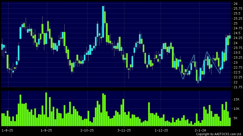 三重底指股票下跌至三個相近的低點後,持續反彈,然後形成上升趨勢,屬利好訊號。三個低點便成為一個穩固的支持位。(港股報價延遲最少十五分鐘。沽空資料截至 2026-01-27 16:25。)