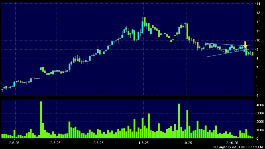 三角形向下突破是指股價的波幅漸漸收窄,在圖表上形成三角形般的狀態。股價在三角形的末端向下突破,下跌趨勢形成,技術走勢偏軟。(港股報價延遲最少十五分鐘。沽空資料截至 2025-10-17 16:25。)