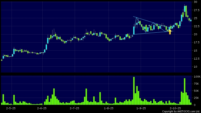 三角形向上突破是指股價的波幅漸漸收窄,在圖表上形成三角形般的狀態。股價在三角形的末端向上突破,形成上升趨勢,技術走勢向好。(港股報價延遲最少十五分鐘。沽空資料截至 2025-10-17 16:25。)
