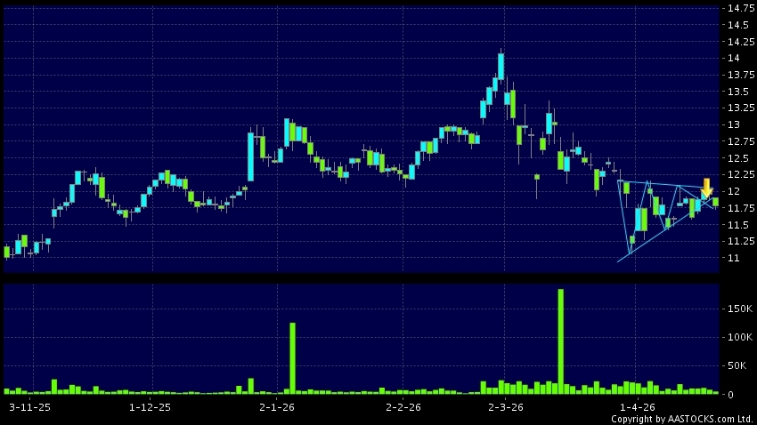三角形向下突破是指股价的波幅渐渐收窄,在图表上形成三角形般的状态。股价在三角形的末端向下突破,下跌趋势形成,技术走势偏软。(港股报价延迟最少十五分钟。沽空资料截至 2026-04-23 16:25。)