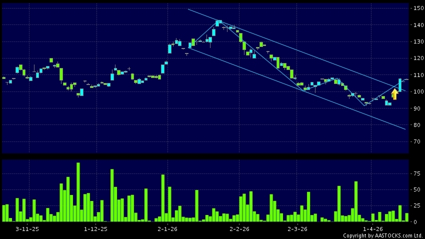 区域突破指股价在过去的一段时间只在一个范围在内活动,然後股价上升作出突破,升穿区域的顶部,技术走势向好。(港股报价延迟最少十五分钟。沽空资料截至 2026-04-20 16:25。)