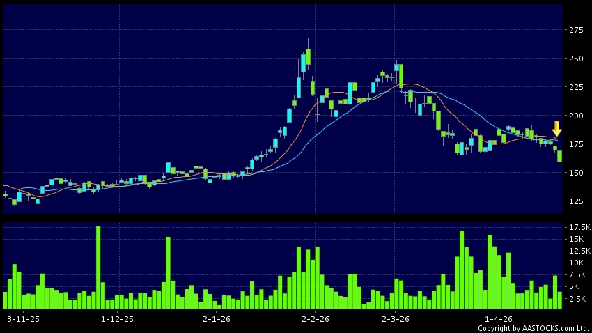 紫金黃金國際(02259.HK) -2.200 (-1.374%) 沽空 $3.19千萬; 比率 2.732% 10天移動平均線跌穿20天移動平均線,出現死亡交叉。現價報159.300,下跌6.128%,成交量3.95百萬股,成交額6.40億。